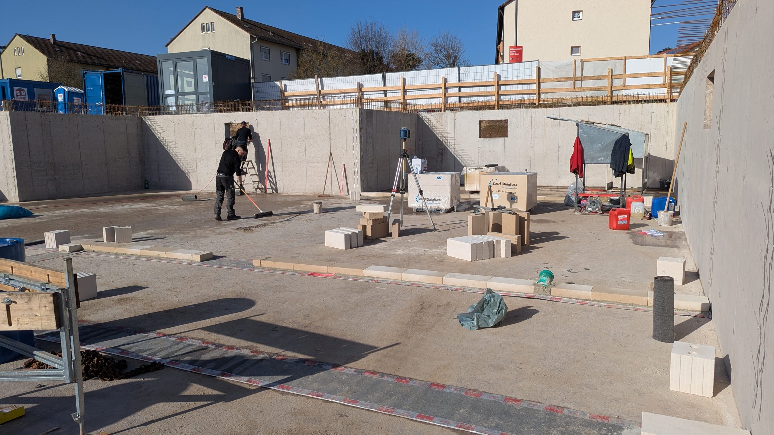 Jetzt geht es im Inneren weiter: Die ersten Steine für die Innenwände im Kellergeschoss sind bereits verlegt. Man kann nun schon genau sehen, wo später die Technikräume und Kellerabteile ihren Platz finden werden. Stein auf Stein wächst unser Mehrfamilienhaus von unten nach oben.