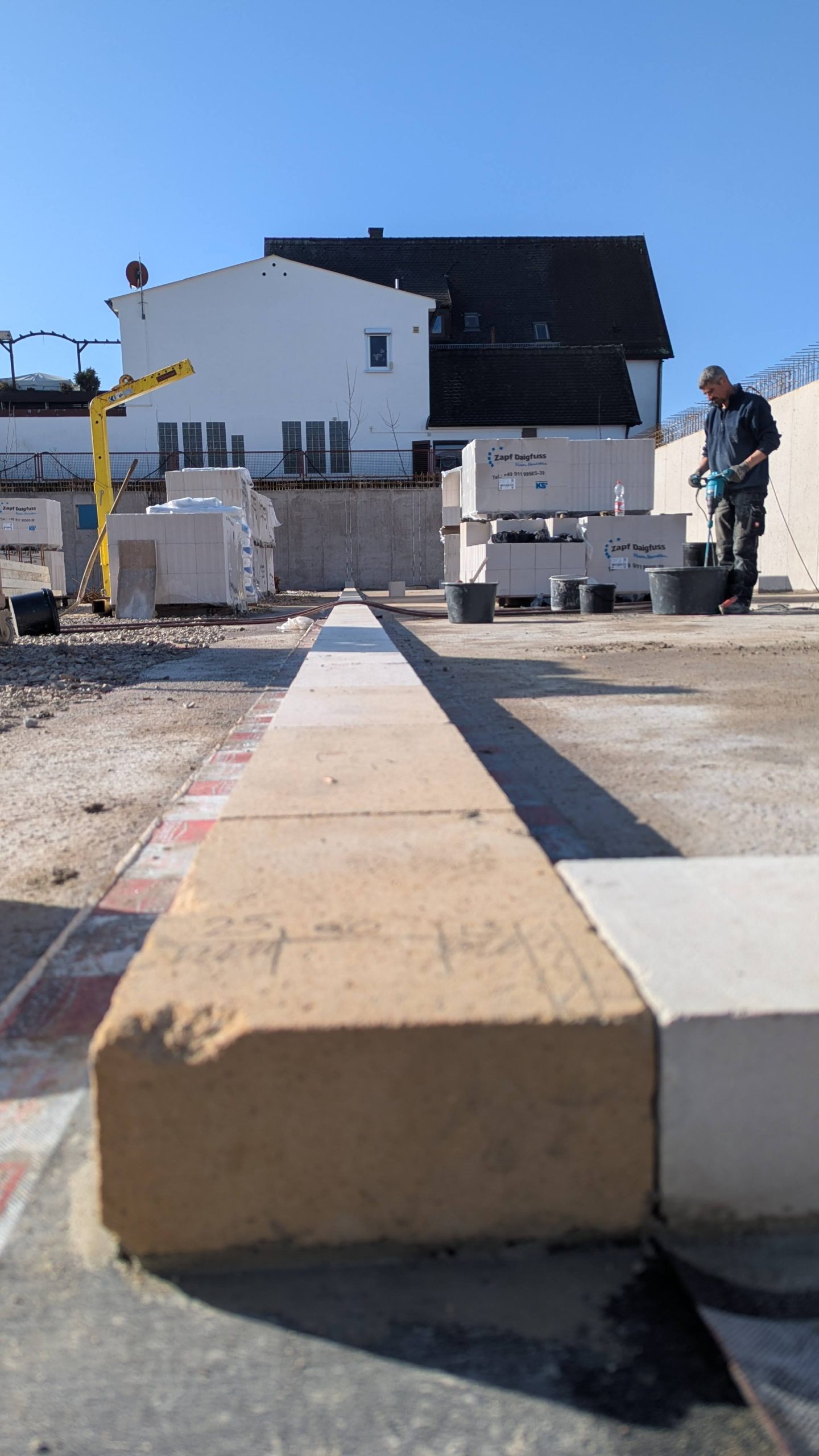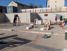 Jetzt geht es im Inneren weiter: Die ersten Steine für die Innenwände im Kellergeschoss sind bereits verlegt. Man kann nun schon genau sehen, wo später die Technikräume und Kellerabteile ihren Platz finden werden. Stein auf Stein wächst unser Mehrfamilienhaus von unten nach oben.